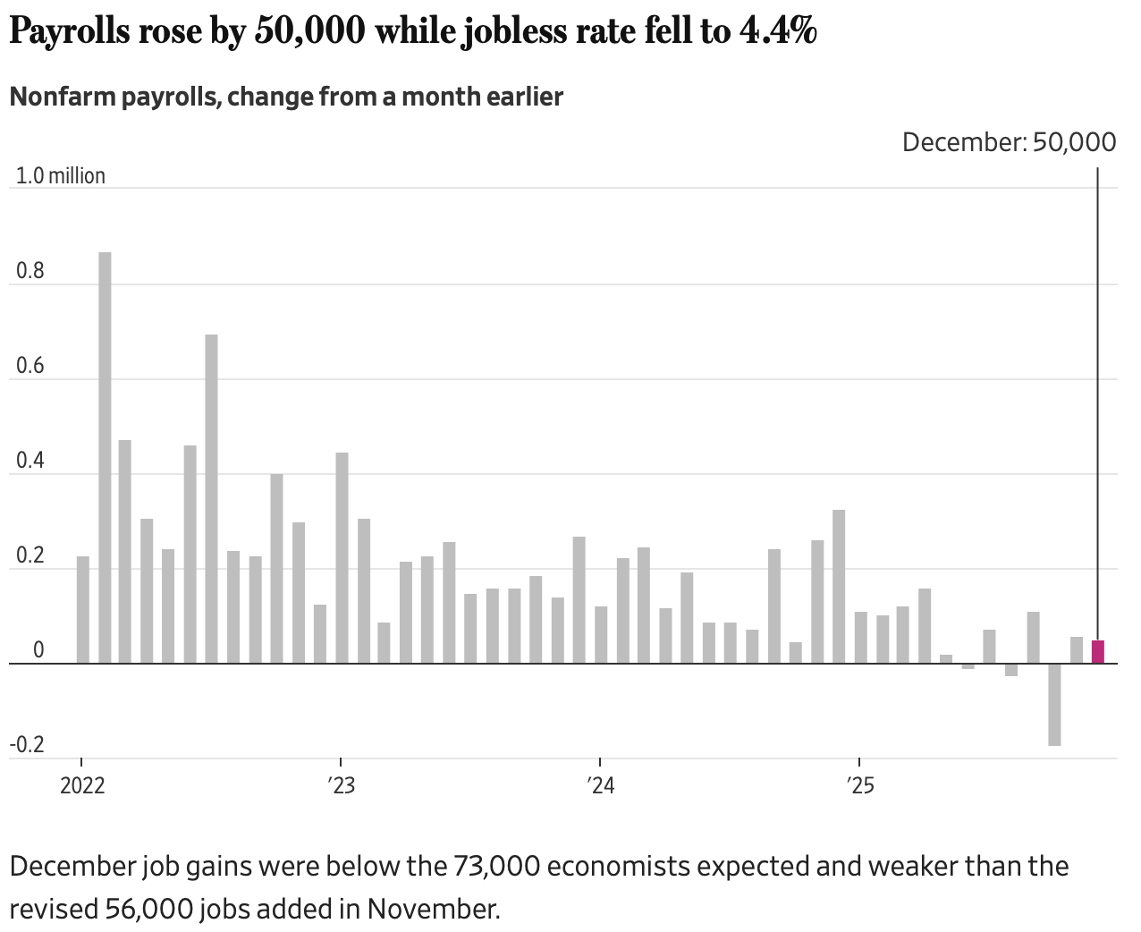 Payroll growth came in soft, with employers adding just 50,000 jobs versus expectations closer to 70,000. At the same time, the unemployment rate unexpectedly slid to 4.4%, beating forecasts and giving the headline number a healthier glow than the hiring data underneath.